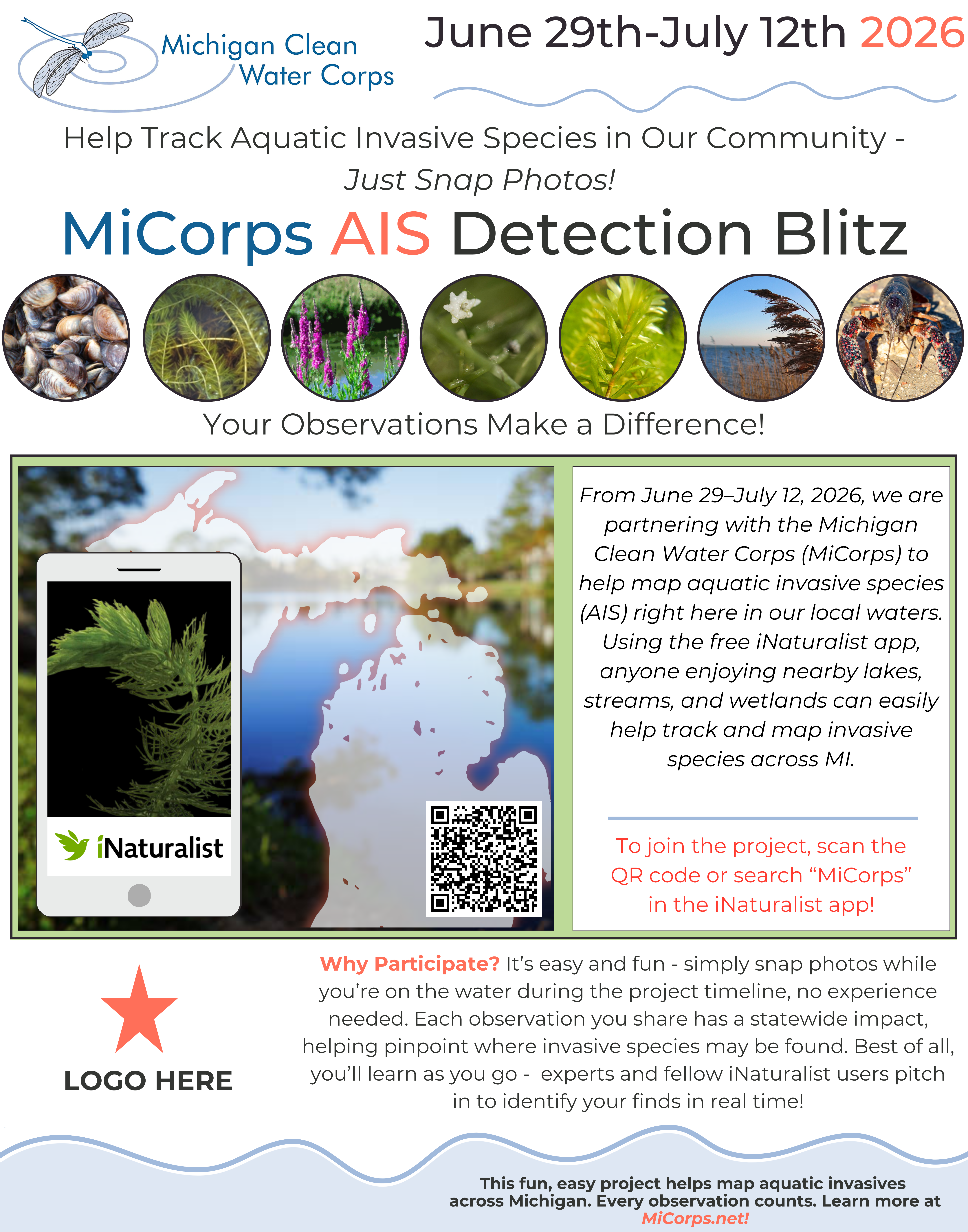 The MiCorps AIS Detection Blitz is a statewide community science event aimed at identifying and documenting aquatic invasive species such as zebra mussels, Eurasian watermilfoil, or anything else you suspect may be invasive in Michigan’s lakes, rivers, and wetlands. Organized by the Michigan Clean Water Corps (MiCorps), this Blitz welcomes volunteers of all backgrounds, whether you're a seasoned naturalist or a first-time observer. Between June 29 and July 12, 2026, simply snap photos of potential invasive species and upload them to the MiCorps project on the free iNaturalist app. By working together in this coordinated effort, we can track the spread of AIS, strengthen early detection strategies, and inform better management decisions. Whether you're on the water for the July 4th holiday or just enjoying a local spot, every observation counts!